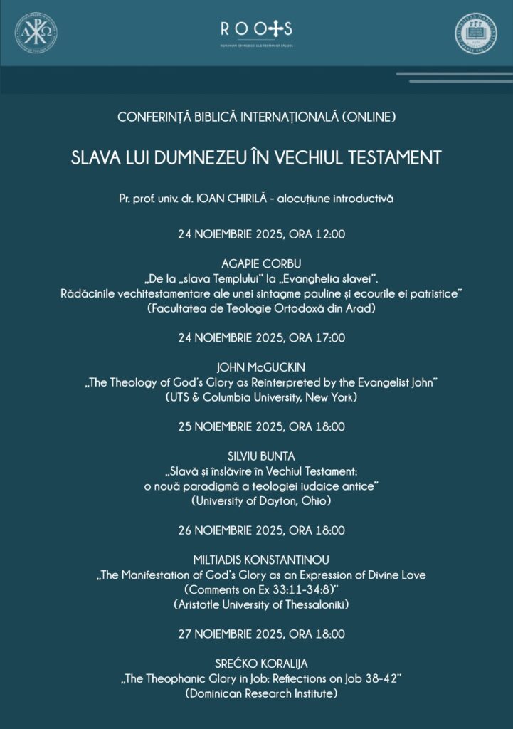 Vă invităm să participați la conferința biblică internațională ROOTS cu titlul „Slava lui Dumnezeu în Vechiul Testament” care se va desfășura on-line în intervalul 24-27 noiembrie 2025. Invitatul nostru special este Pr. Prof. John McGuckin.