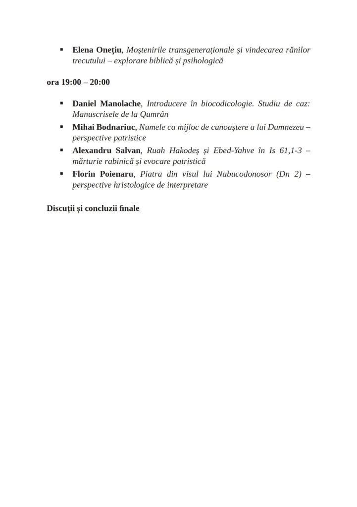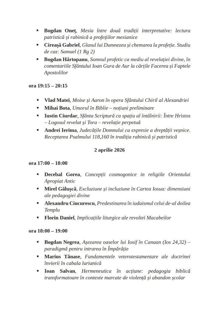 – repere și direcții de cercetare” (ediția a V-a) care se va desfășura on-line în intervalul 1-2 aprilie 2026, începând cu ora 17:00. Vor susține comunicări doctoranzi și doctori ai Facultăților de Teologie Ortodoxă din București, Iași, Oradea și Cluj-Napoca.
