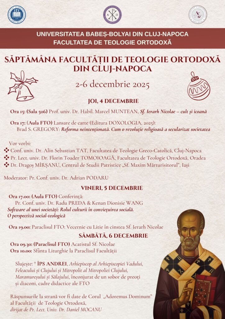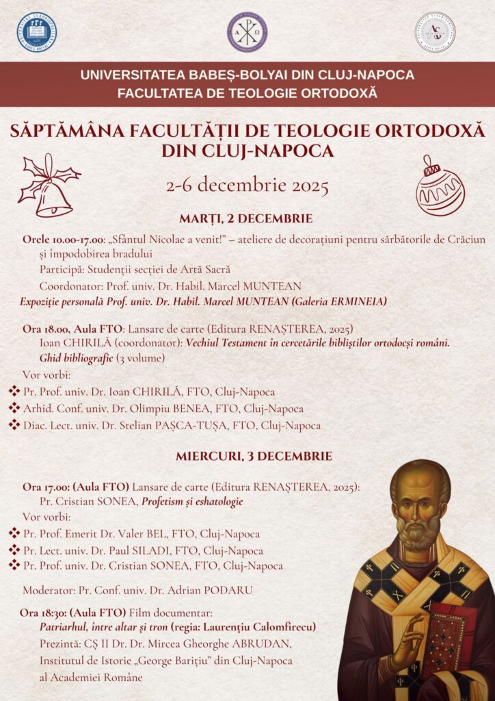 Aula Facultății de Teologie Ortodoxă, Cluj-Napoca 27 noiembrie 2025 Programul Conferinței: 10,00 - 10,15 – Cuvânt de Deschidere: Prof. Teofil Tia – Decanul Facultății de Teologie Ortodoxă Prof. Stelian Tofană – Președinte UBR 10,15 - 13,15 – REFERATE Johannes Klein –...