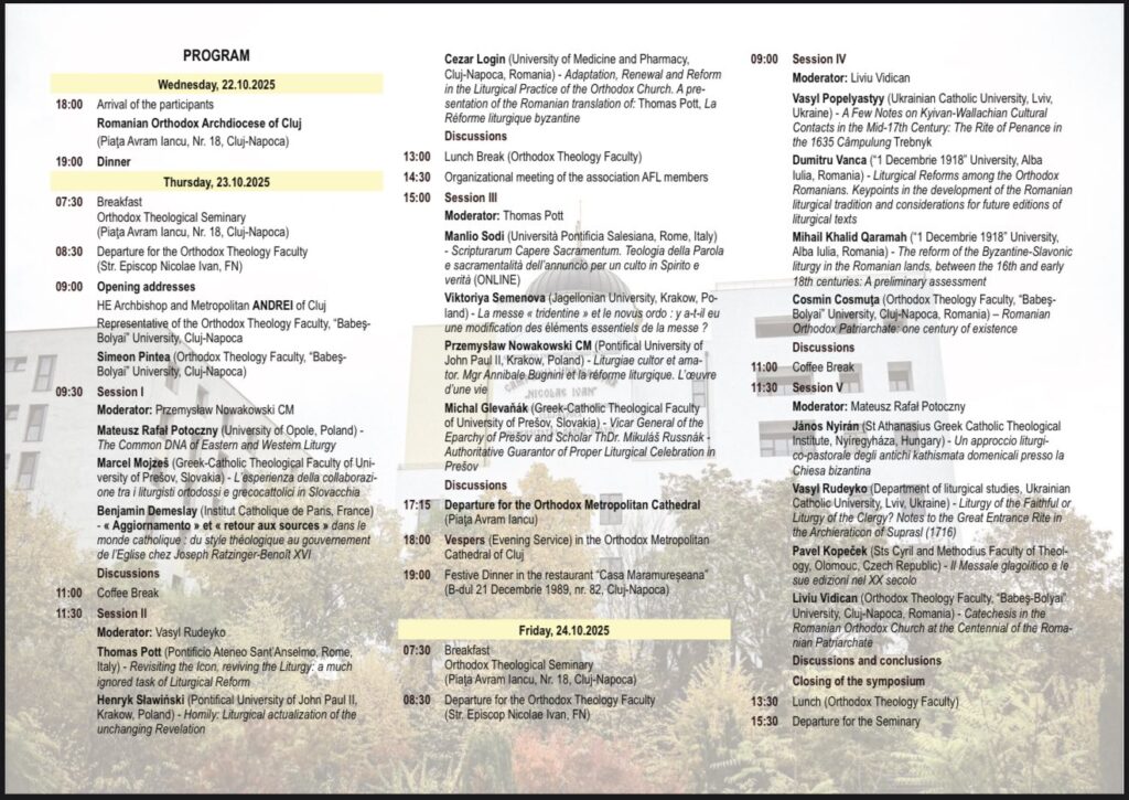 În perioada 23–24 octombrie 2025, la Facultatea de Teologie Ortodoxă a Universității „Babeș-Bolyai” din Cluj-Napoca, se desfășoară Simpozionul Internațional de Liturgică „Ad Fontes Liturgicos”, ajuns la cea de-a XVI-a ediție, cu tema: